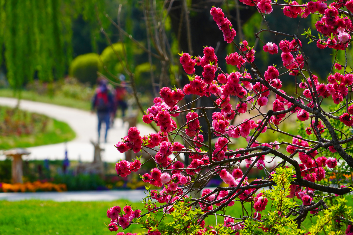 漫山遍野,繁花争艳,粉白嫣红交织成绚烂锦缎.