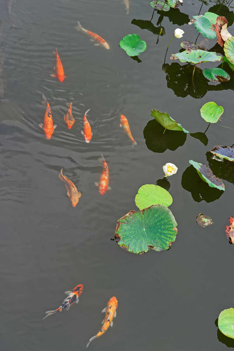 荷塘和鱼儿总是分不开的景色,清澈的湖水覆着又圆又大的荷叶,鱼儿们